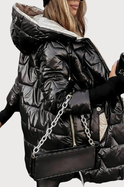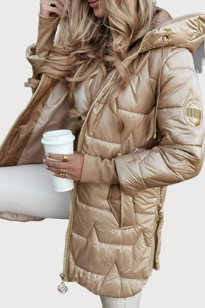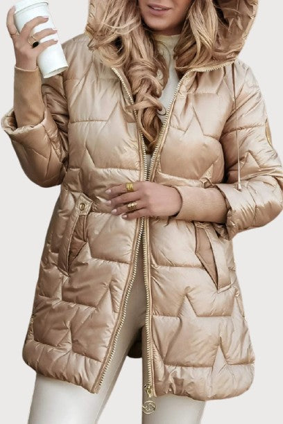 With Nolwen, you feel protected and cared for: a softness that comforts, warmth that reassures, a silhouette that enhances. The hood and padding shield you from unexpected weather, allowing you to experience autumn with serenity and class, without sacrificing your natural elegance.