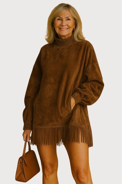 Faux Suede Turtleneck Dress With Fringe Hem