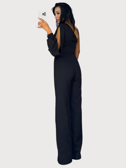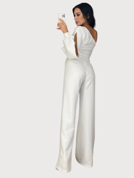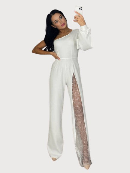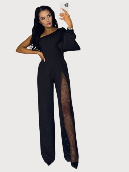 Shine with confidence in the Stella Luxe Jumpsuit. Designed with a striking one-shoulder neckline, flowing sleeve, and a daring thigh-high slit with shimmering sheer detail, this piece is the perfect blend of elegance and allure. Crafted for evening occasions, galas, and nights out, it’s a statement look that ensures all eyes are on you.