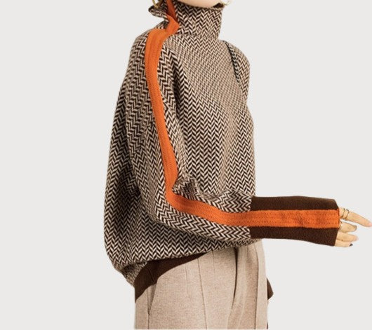 Turn heads with a stylish bold herringbone pattern and warm orange accents, bringing a touch of fresh elegance to your winter wardrobe.