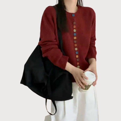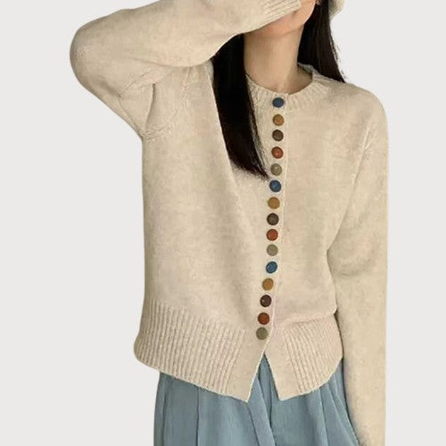 • Charming Button Detailing – A row of multicolored buttons brings personality to a classic knit.