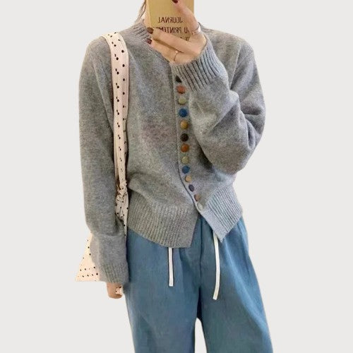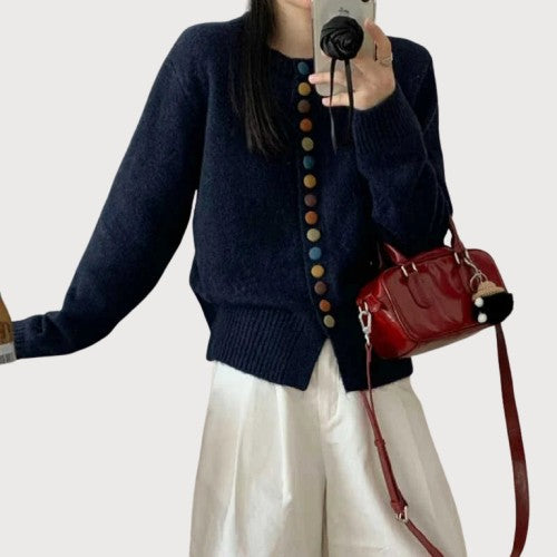 The Celestine Cardigan was created for women who love a balance of timeless style and cozy warmth. Crafted from a soft, heavy knit, its playful row of colorful buttons adds a touch of cheer while the classic silhouette makes it endlessly versatile. Whether you’re layering for a chilly autumn walk or enjoying a relaxed evening at home, this cardigan is a piece you’ll reach for again and again.